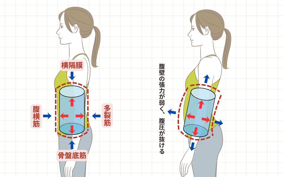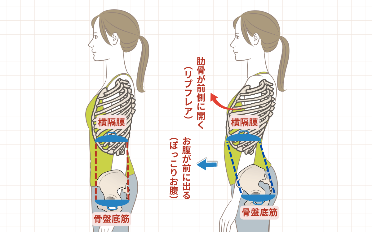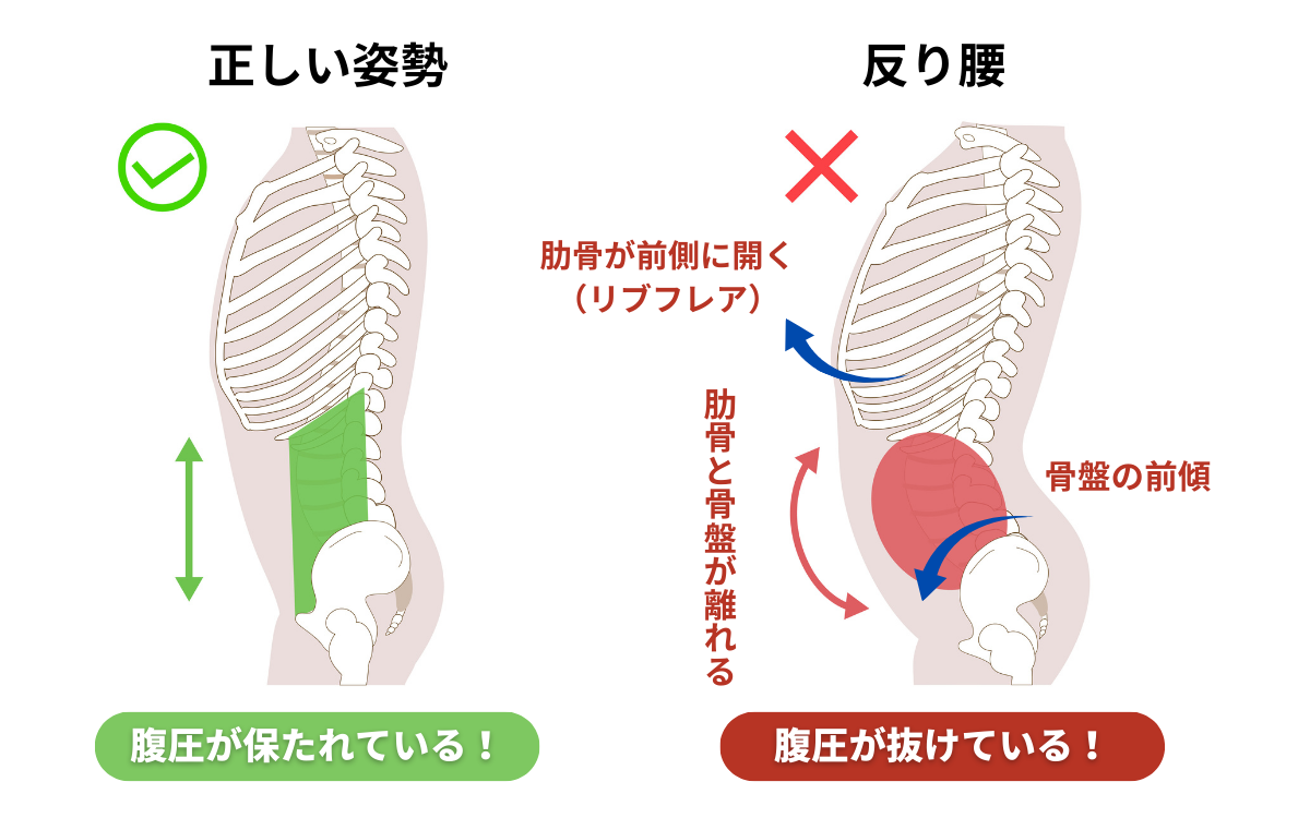 肋骨と骨盤の位置関係が崩れ、腹部を前から支えにくい状態になっていることが大きく関係しています。